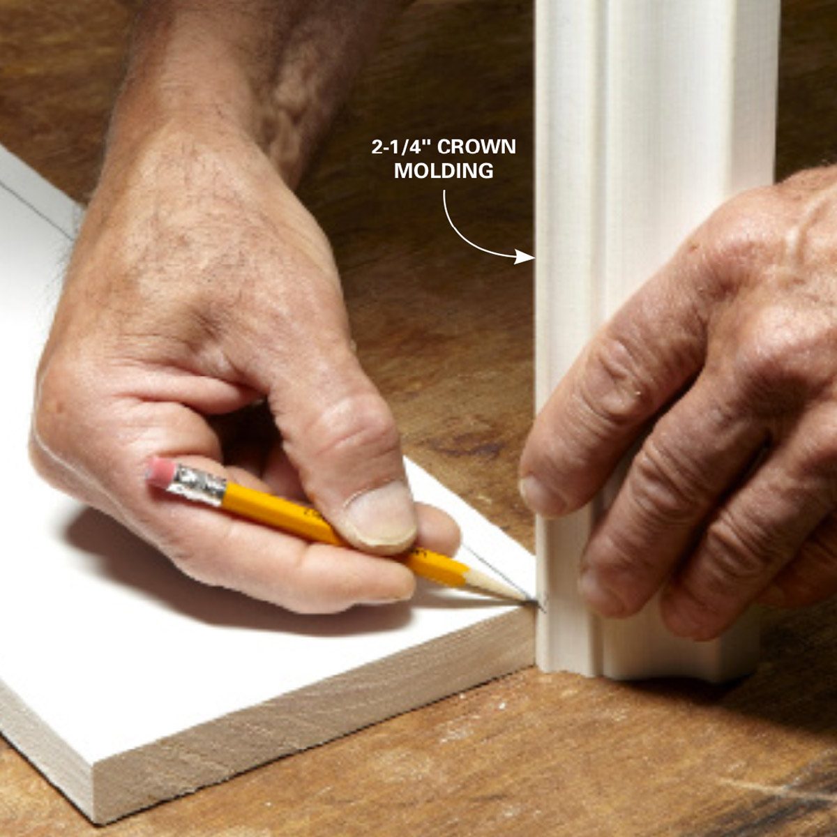 With the window crown molding and other parts cut to rough length, and the reveals marked on the jambs, the fastest and most accurate method for marking the trim for cutting is to simply hold the molding in place and mark it. It’s foolproof. You don’t have to measure, do math or remember any numbers.