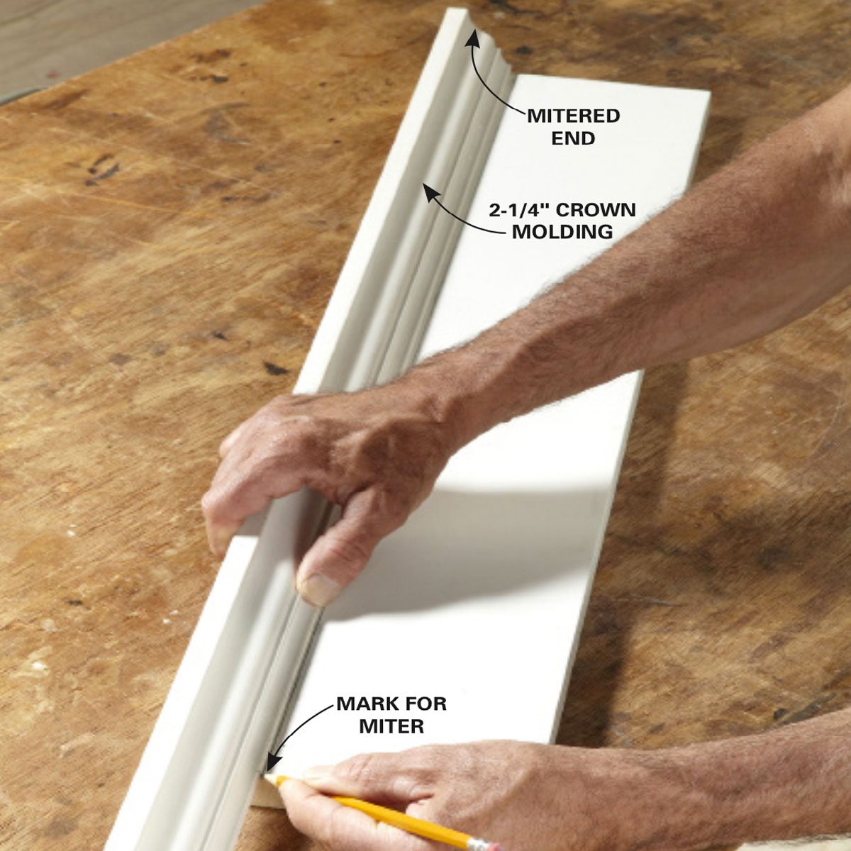 Build a simple jig to hold the crown molding at the correct angle while you cut it. Position the molding upside down and set the saw to 45 degrees. Avoid cutting all the way through the jig.