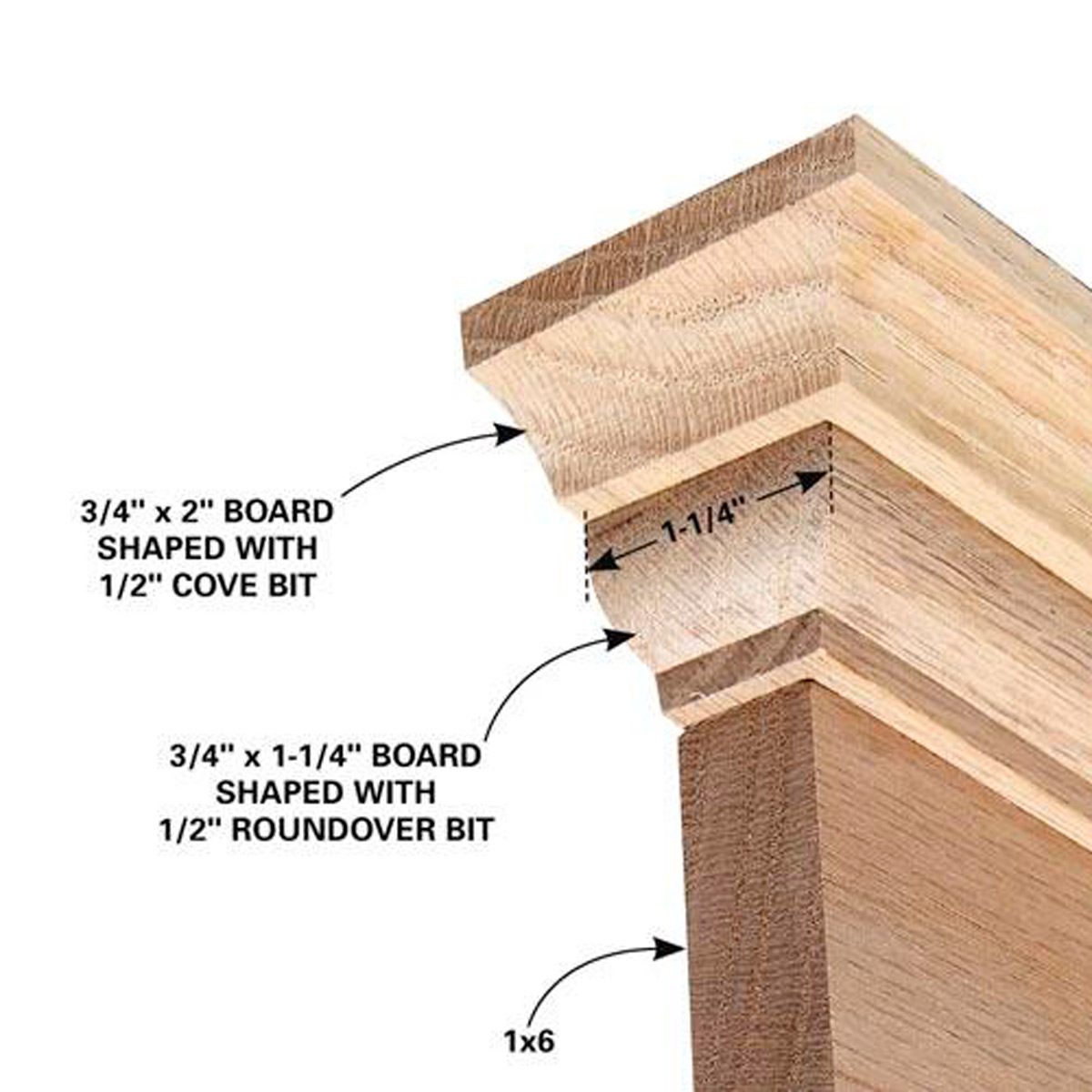 You don’t have to buy moldings. With a little ingenuity and a few standard router bits, you can make your own door and window trim. Figure B shows an example of a cap molding for a head casing that we made by stacking two pieces of 3/4- in. oak. Shaping the edges of wood strips with a router and stacking them to make bigger moldings is a great technique for making your own moldings.