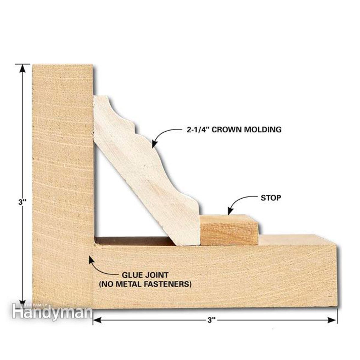 This jig holds the crown molding at the correct angle in the miter saw, so it’s easy to make accurate miters every time. Glue two strips of scrap wood together at a right angle. Then set the crown molding upside down in the jig and mark the position of the stop. Glue the stop to the bottom and you’re ready to cut some moldings.