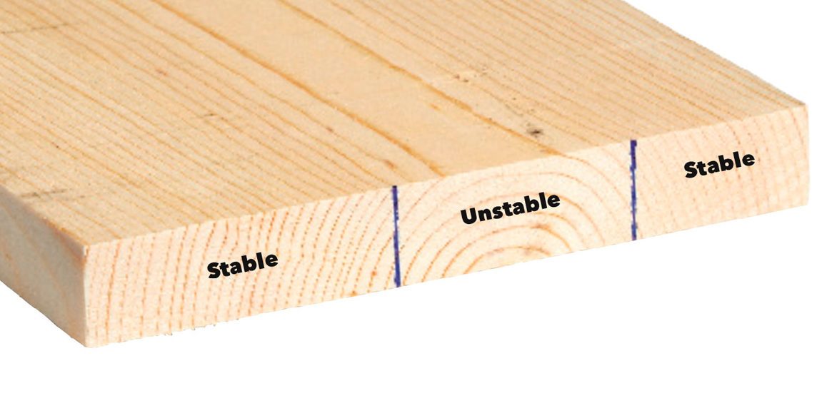 The way a board is cut from a log affects its stability. Quarter-sawn boards are the most stable; they don’t “move” as much with changes in humidity. Home centers don’t carry quarter-sawn lumber; it’s too expensive. But when you’re sorting through the piles, look at the end grain. Sometimes you’ll find growth rings running perpendicular to the board’s face on the outer edges. This is essentially quarter-sawn lumber. You can rip these edges free of the less stable center.