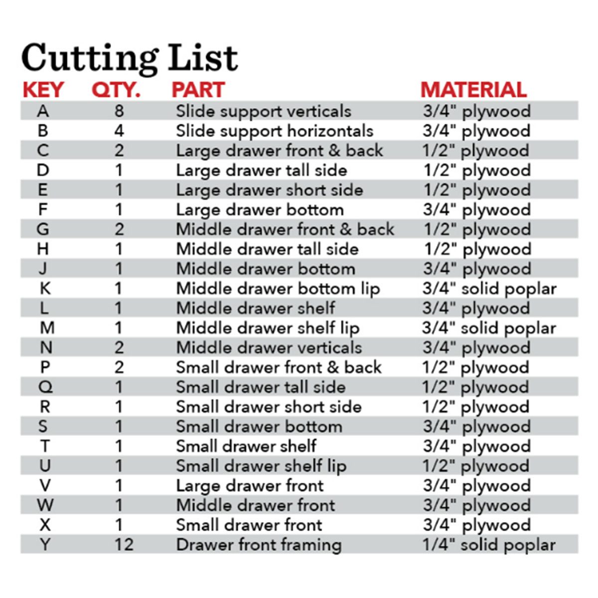 To calculate the drawer width, measure the opening, then subtract the thickness of two drawer slides. Make the drawers as deep as the drawer slide length.