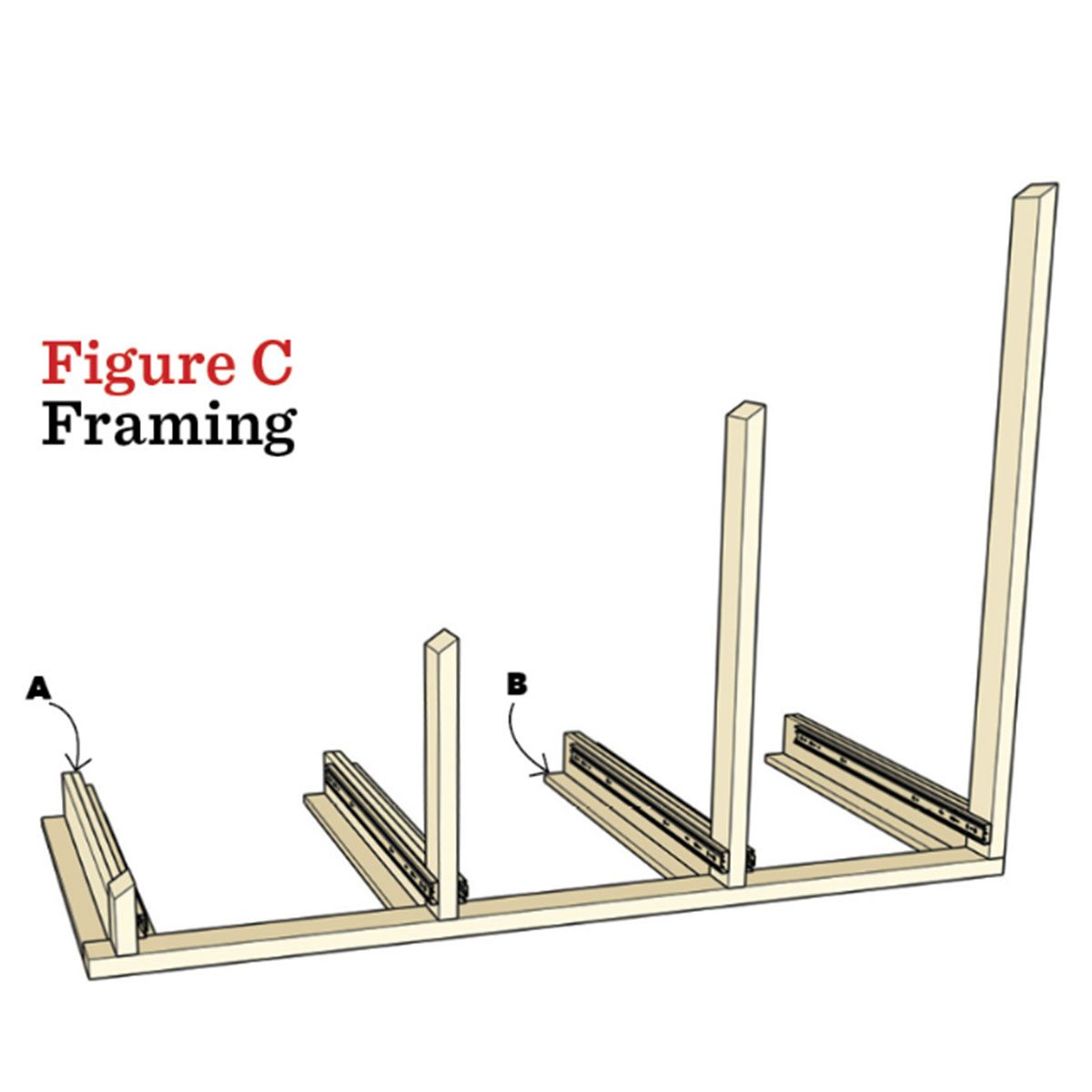 Use a framing square to make sure the supports are square to the bottom plate so the drawer slides won’t bind.